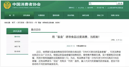 1月12日,“中消协点名肯德基泡泡玛特”登上热搜。中消协指出,肯德基以限量款盲盒销售即时食用商品是以“饥饿营销”手段刺激消费,导致消费者为了获得限量款盲盒而超量购买造成无谓的食品浪费。