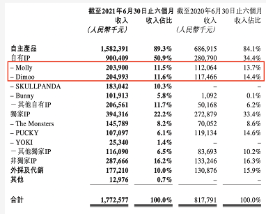 而随后打造出来的新IP Dimoo,吸金能力同样受到挑战。财报显示,2021年上半年Dimoo带来2.05亿元的营收,占总营收为11.6%,而2020年同期Dimoo的收入占总营收比为14.4%。