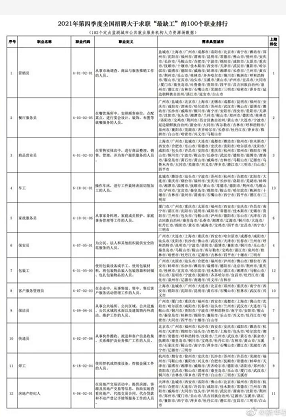 人力资源和社会保障部22日发布2021年四季度“最缺工”的100个职业排行,其中,营销员、餐厅服务员、商品营业员、车工、家政服务员、保安员、包装工、客户服务管理员、保洁员、快递员等职业位列排行前十。