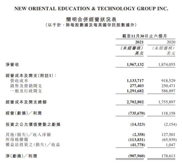 2月22日,新东方披露截至2021年11月30日的六个月财务数据。数据显示,报告期内新东方的净营收为19.67亿美元,上年同期为18.74亿美元;净亏损9.08亿美元(约合人民币57.4亿元),上年同期盈利1.79亿美元。