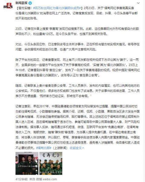 除了平台方的回应,记者查看发现,网上有不少网友都在相关视频下方评论其为“骗子”。这一两天,全国多地的一些警方平台也发布了关于李赛高的视频,“实锤”其为“缅北诈骗团伙”。23日上午10点,记者看到抖音号“贵定公安”,发布了一则关于李赛高唱歌的视频。视频中提到“缅甸网红李赛高真实身份是缅北诈骗团伙”。该账号认证为“贵定县公安局”。