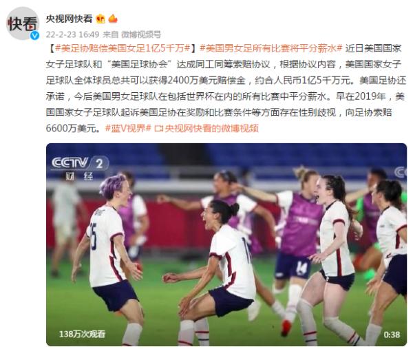 近日美国国家女子足球队和“美国足球协会”达成同工同酬索赔协议,根据协议内容,美国国家女子足球队全体球员总共可以获得2400万美元赔偿金,约合人民币1亿5千万元。美国足协还承诺,今后美国男女足球队在包括世界杯在内的所有比赛中平分薪水。早在2019年,美国国家女子足球队起诉美国足协在奖励和比赛条件等方面存在性别歧视,向足协索赔6600万美元。