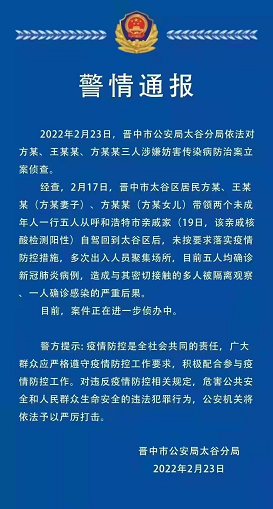 2月23日,晋中市公安局太谷分局依法对方某喜、王某莲、方某慧涉嫌妨害传染病防治罪立案侦查。