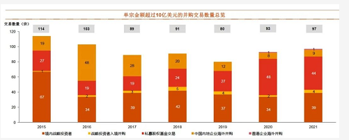 2021年国内共有97宗超大型并购交易,交易金额均超10亿美元。其中,不少交易与产业升级、双循环、低碳环保等主题相关。由私募股权基金主导的超大型交易数量达40多宗的历史高位,近年来数量迅猛增长。