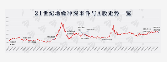 据中泰证券统计,自2000年以来,全球共经历了马其顿武装冲突(2001年)、阿富汗战争(2002年)、伊拉克战争(2003年)、黎巴嫩战争(2006年)、俄罗斯格鲁吉亚战争(2008年)、科特迪瓦内战(2010年)、利比亚战争(2011年)、叙利亚内战(2011年)、克里米亚冲突(2014年)、第二次卡拉巴赫战争(2020年)和俄乌冲突(2022年)等至少11起地缘冲突事件。从21世纪地缘冲突事件与A股走势图可见,长期来看,地区性的地缘冲突危机,对股票市场的走势影响有限。