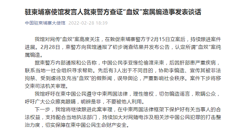 对网传“血奴”案高度关注,在敦促柬埔寨警方于2月15日立案后,持续跟进案件进展。2月28日,柬警方向大使馆通报了初步调查结果并发布公告,认定所谓“血奴”案纯属编造。