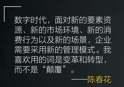 陈春花:我认为不能用“颠覆”这个词。因为管理模式、管理方法本身其实是一个持续完善、迭代、更新的过程,每个阶段采用的管理模式都跟每个阶段的发展、经营、战略相关,这种发展战略经营相关的管理模式其实是匹配于当时的战略选择、经营条件,以及所要实现的经营模式。