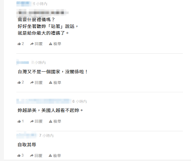对于美方官员见蔡英文态度轻慢“不遵守服装礼仪”,有网友直言这是“(民进党)自取其辱”,无奈道“蔡英文被美方代表看不起也不是第一次了”。