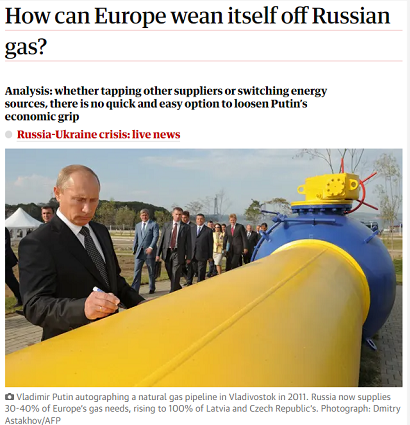 根据美国汽车协会的数据,加油站的汽油价格比一年前上涨了33% ,通货膨胀处于40年来的高峰,在很大程度上就是由汽油价格推动的。在地球另一端,俄罗斯的天然气占欧洲化石燃料消费量的三分之一。