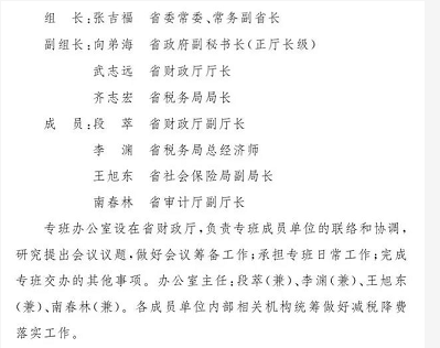 主要职责:贯彻落实中央减税降费决策部署,研究深化我省减税降费措施,形成叠加效应;统筹协调和指导全省减税降费工作,研究解决相关重点难点问题,协调政府相关部门数据信息共享,全面反映全省减税降费成效,助力市场主体发展。