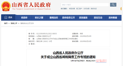 山西决定成立“山西省减税降费工作专班”,作为减税降费工作日常议事协调机构,确保各项减税降费政策措施在山西不折不扣落实到位。