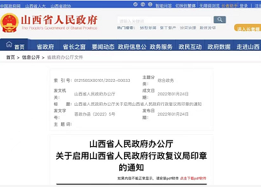 根据省相关通知,山西省司法厅行政复议与应诉处(原加挂山西省人民政府行政复议办公室牌子)更名为行政复议综合管理处(加挂山西省人民政府行政复议局牌子);现启用“山西省人民政府行政复议局”印章,原“山西省人民政府行政复议办公室”印章同时废止。