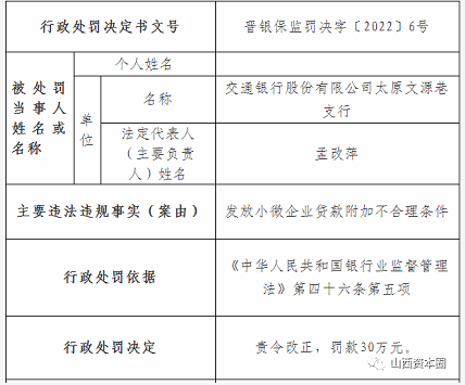 而交通银行太原文源巷支行被罚则因为发放小微企业贷款附加不合理条件,违反《中华人民共和国银行业监督管理法》第四十六条第五项,同样被责令改正,罚款30万元。另外,陈晓鹏亦因对太原文源巷支行发放小微企业贷款附加不合理条件负有责任被山西银保监局予以警告处分。