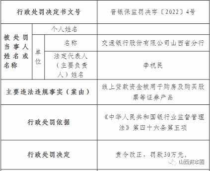 山西银保监局处罚公告显示,交通银行山西省分行此次被罚系线上贷款资金被用于购房及购买股票等证券产品违反《中华人民共和国银行业监督管理法》第四十六条第五项,被处以责令改正,罚款30万元。
