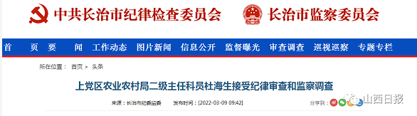 上党区农业农村局二级主任科员杜海生接受纪律审查和监察调查