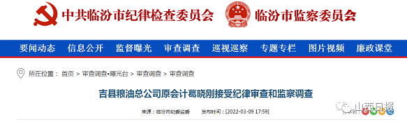 吉县粮油总公司原会计葛晓刚接受纪律审查和监察调查