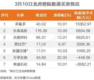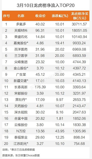 3月10日,上榜龙虎榜个股中,资金净流入最多的是多氟多,为3.07亿元。数据显示,该股日内涨停收盘,全天换手率6.42%。资金净流入居前的深股通席位净买入1.54亿元,国泰君安上海江苏路净买入1.2亿元。