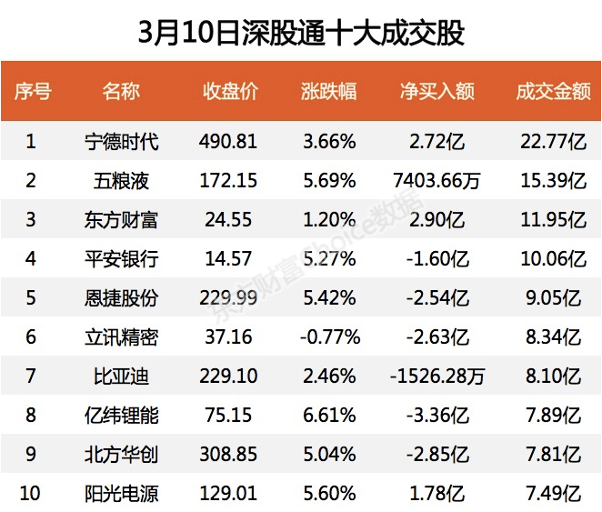 3月10日,北向资金当日成交净买额为-33.74亿元。其中,沪股通当日成交净买额为-11.18亿元;深股通当日成交净买额为-22.56亿元。