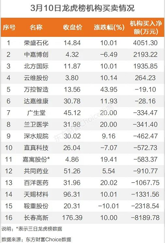 机构参与龙虎榜中个股共涉及16股,其中4股被机构净买入,荣盛石化被买入最多,为4051.3万元。另外12股被机构净卖出,长春高新被卖出最多,为8189.78万元。