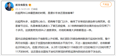 抗疫两年以来最困难的时期,是漫长冬夜还是倒春寒?来源:@张文宏医生