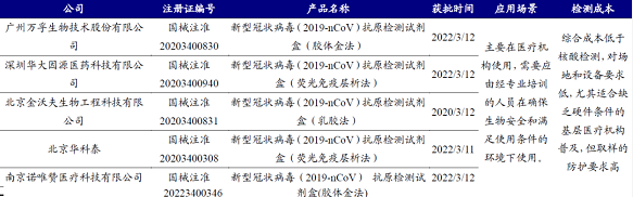 3月12日,国家药监局发布通告,批准南京诺唯赞、北京金沃夫、深圳华大因源、广州万孚生物、北京华科泰生物的新冠抗原产品自测应用申请变更。自此五款新冠抗原自测产品正式上市。