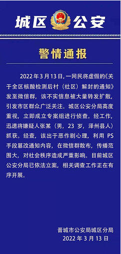 3月13日,晋城市公安局城区分局发布警情通报,一网民因恶作剧篡改防控通知被抓获。