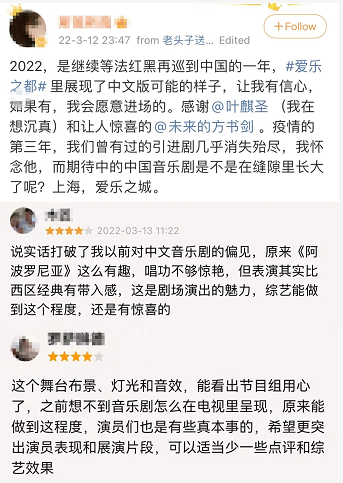 首期节目播出后收获了很多反馈,一方面,它帮助部分观众打破壁垒,看到了音乐剧与中文和本土化故事的适配性,也起到了音乐剧“科普”的作用,一定程度上存在惊喜。另一方面,音乐剧的专业性与综艺节目的戏剧性如何平衡依然是一道难题。