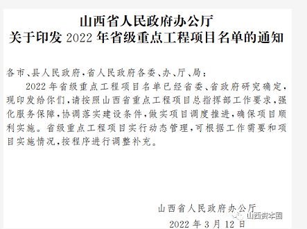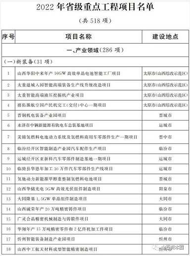 3月12日,山西省政府办公厅正式印发2022年省级重点工程项目名单,共计518项,其中产业领域286项,科技创新领域18项,基础设施领域142项,社会民生领域72项。