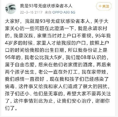 大家好,我就是93号无症状感染者本人,关于大家关心的一些问题在此澄清一下,我是永靖农村的,我是汉族,家里当时对上户口不重视,95年我4岁多的时候,家里人才给我报的户口,按照上户口的时间给我报的出生日期,所以我身份证上是95年的,我老公比我大5岁,我们是08年认识的,属于自由恋爱,后来在他们老家摆的酒席,再后来两个孩子出生,老公一直在外打工,我在家带娃,我们感情一直很好,现在我和孩子们已经感染了病毒,这件事又给我和家人们造成了很大的困扰,孩子们还小,他们是无辜的,希望大家不要再关注了,这件事情到此为止,让我们安心治疗,谢谢你们了。