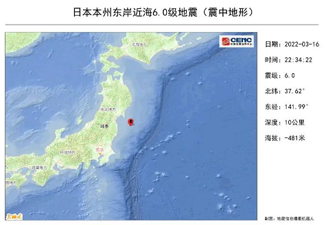 3月16日22时34分在日本本州东岸近海(北纬37.62度,东经141.99度)发生6.0级地震,震源深度10千米。