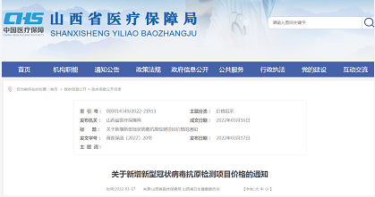为服务新冠病毒疫情防控需要,支持基层开展新冠病毒抗原检测工作,山西省医疗保障局牵头会同省卫生健康委员会制定印发《关于新增新型冠状病毒抗原检测项目价格的通知》,增设了新冠病毒抗原检测价格项目。