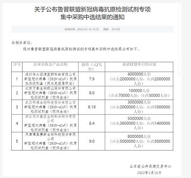 近日,山西省医保局根据国务院应对新型冠状病毒肺炎疫情联防联控机制《关于印发新冠病毒抗原检测应用方案(试行)的通知》中“基层医疗卫生机构配备抗原检测试剂纳入集中招标采购,可通过省级集中招采,不断降低检测试剂价格,减轻检测费用负担”要求及省委省政府安排部署,迅速行动,与山东省医保局联合开展了新冠病毒抗原检测试剂集中采购。3月16日已开标产生了中选结果,11家新冠病毒抗原检测试剂生产企业申报参加,5家企业中选,新冠病毒抗原检测试剂价格由市场平均价格30多元降至9元以下,最低价7.9元/人份,平均降幅74.7%,有效降低了新冠抗原检测试剂价格,减轻了检测费用负担。