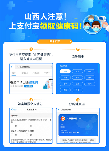 山西省疫情防控办协调省疫情防控各成员单位,在入晋公路交通卡口、车站、机场设立了宣传板、易拉宝等方式积极宣传引导,确保外省来晋返晋人员在第一落点下载“支付宝APP”,填报信息后注册申领个人山西健康码。“山西健康码”作为外省来晋返晋人员在我省通行的有效标识,各类公共场所、经营场所,特别是机关、企事业单位、酒店、餐馆、商超、影剧院、图书馆、书店、旅游景点等人员聚集场所,均要严格核验“山西健康码”状态,将其作为通行必须凭证。