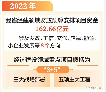 2022年经济建设领域重点项目概括为“3+5”,即:三大战略部署,五项重大工程。具体为:全力推动山西中部城市群高质量发展,目前,省财政已安排预算资金8亿元,专项支持保障中部城市群项目建设。强势打造太忻一体化经济区增长极,目前,省财政已下达太原、忻州两市各2亿元资金,支持两市加快建设。大力实施市场主体倍增工程,目前,省财政厅已落实市场主体倍增财政政策相关保障资金约43亿元,将为市场主体倍增工程的稳步推进提供强力财政保障。2022年,金融机构可以介入的财政经济建设领域五项重大工程主要涉及“铁、公、机”建设,具体为:集大原、雄忻铁路建设项目,汾石、临浮高速公路建设项目和武宿机场三期改扩建项目。