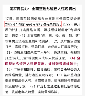 最近国家网信办就整了个清朗发布会,内容字字诛心:全面整治劣迹艺人违规复出、被封账号违规转世...