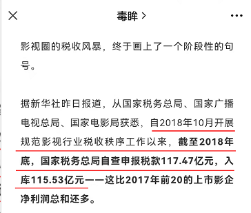 光是2018年最后一个季度,影视行业自查申报税款117.47亿元,入库115.53亿元。