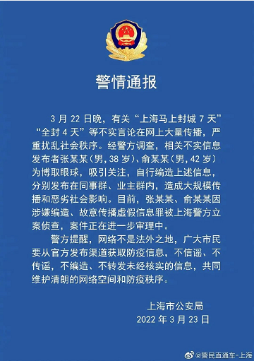 3月22日晚,有关“上海马上封城7天”“全封4天”等不实言论在网上大量传播,严重扰乱社会秩序。经警方调查,相关不实信息发布者张某某(男,38岁)、俞某某(男,42岁)为博取眼球,吸引关注,自行编造上述信息,分别发布在同事群、业主群内,造成大规模传播和恶劣社会影响。目前,张某某、俞某某因涉嫌编造、故意传播虚假信息罪被上海警方立案侦查,案件正在进一步审理中。