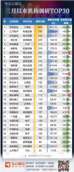 具体看,三月以来,机构调研超百人次的公司有26家,中科创达(843次)、汇川技术(743次)、迈为股份(490次)、周大生(329次)、华阳集团(313次)、埃斯顿(310次)、容百科技(265次)、燕京啤酒(241次)、长春高新(235次)、格林美(229次)位居前十。