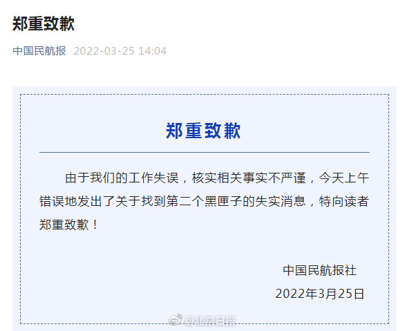 中国民航报微信公众号刚刚发布《郑重致歉》,全文如下:由于我们的工作失误,核实相关事实不严谨,今天上午错误地发出了关于找到第二个黑匣子的失实消息,特向读者郑重致歉!