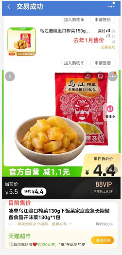 “去年1月初,我在天猫超市买了2包150g的乌江涪陵脆口榨菜,原价3.5元/包,实际支付优惠为3.33元/包。但是现在点进同一个链接同一款产品,已经变成了原价5.5元/包,折后4.4元/包的130g榨菜了。”90后消费者鲍晓果说。