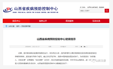 近期,国内新冠肺炎疫情持续高位运行,3月25日以来,国内新增本土确诊病例和无症状感染者连续2日突破5500例,波及国内70余个城市。截至3月27日7时,现有中高风险区高达616个。为持续坚持“外防输入、内防反弹”总策略和“动态清零”总方针,坚决巩固我省防控成果、牢牢守住山西阵地,进一步保障三晋人民身体健康和生命安全,山西省疾病预防控制中心健康提示如下: