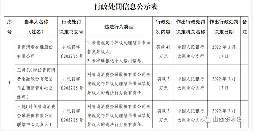 根据处罚信息,时任晋商消费金融山西运营中心总经理王贝贝、时任晋商消费金融联络中心负责人王越,对晋商消费金融未按规定将异议处理结果书面答复异议人的违法行为负有责任,被分别罚款3万元。