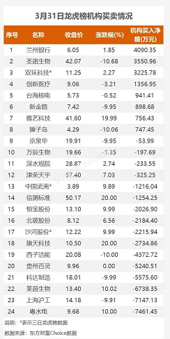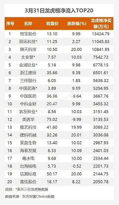 3月31日,上榜龙虎榜个股中,资金净流入最多的是恒宝股份,为1.34亿元。数据显示,该股日内涨停收盘,全天换手率23.98%。资金净流入居前的中国银河绍兴净买入2679.46万元。