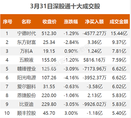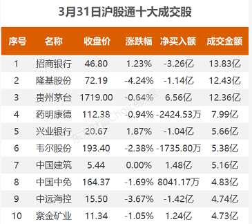3月31日,北向资金当日成交净买额为10.53亿元。其中,沪股通当日成交净买额为17.29亿元;深股通当日成交净买额为-6.76亿元。
