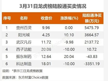 陆股通参与龙虎榜中个股共涉及6股,其中4股被陆股通净买入,贵州百灵被买入最多,为5475.79万元。另外2股被陆股通净卖出,科达制造被卖出较多,为3351.19万元。