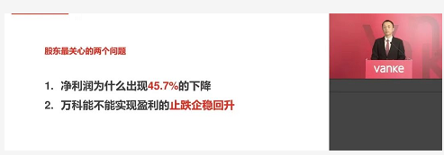 在业绩会召开的头天晚上,郁亮其实非常忐忑。“就像一个学生没考好试,要拿成绩单给父母看一样。”郁亮说,“我完全能够理解股东各种各样的情绪,不满也好,失望也好,困惑也好,关切也好,我感同身受。”