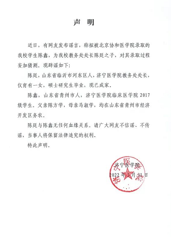 3月31日下午,济宁医学院官方微博发布辟谣声明称,近日,有网友发布谣言,称拟被北京协和医学院录取的该校学生陈鑫,为该校教务处处长陈廷之子,对其录取过程妄加猜测。现辟谣如下: