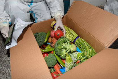 3月31日,在吉林市昌邑区哈达湾街道矿建社区,工作人员检查“蔬菜包”。新华社记者 张楠 摄