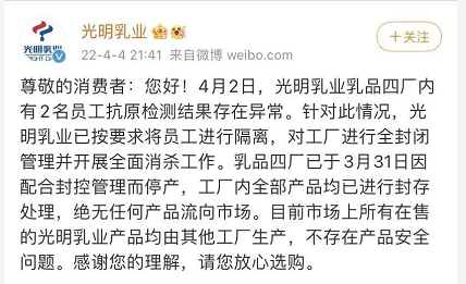 4日晚上,光明乳业官方微博对此发文表示,4月2日,光明乳业乳品四厂内有2名员工抗原检测结果存在异常。针对此情况,光明乳业已按要求将员工进行隔离,对工厂进行全封闭管理并开展全面消杀工作。乳品四厂已于3月31日因配合封控管理而停产,工厂内全部产品均已进行封存处理,绝无任何产品流向市场。