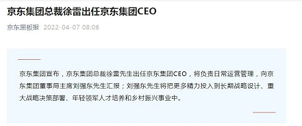 京东集团今天宣布,刘强东将不再兼任京东集团CEO,京东集团总裁徐雷出任京东集团CEO,将负责日常运营管理,向京东集团董事局主席刘强东汇报。